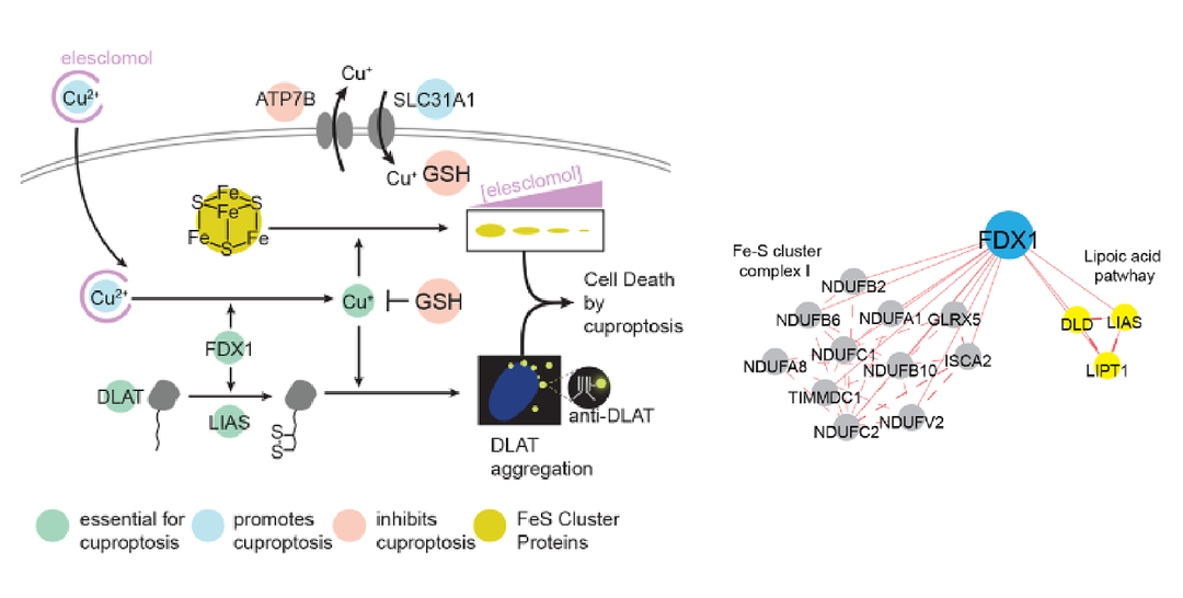 铜死亡是一种由过量铜离子触发的调节性细胞死亡形式,这种由铜诱导的程序性细胞死亡形式不同于其他细胞死亡途径,包括细胞凋亡、铁死亡和坏死性凋亡等。铜死亡的主要过程依赖于细胞内铜离子的积累,铜离子直接结合三羧酸循环(TCA)中的硫辛酸化成分,导致这些蛋白聚集、失调,阻断了三羧酸循环(TCA),而且铜离子诱导Fe-S(铁硫)簇蛋白的减少,引发了蛋白质毒性应激,并诱导细胞死亡。